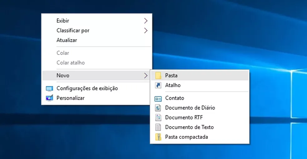 Crie uma nova pasta em qualquer lugar do sistema. Na área de trabalho, clique com o botão direito do mouse sobre o papel de parede, vá em “Novo” e clique em “Pasta”;